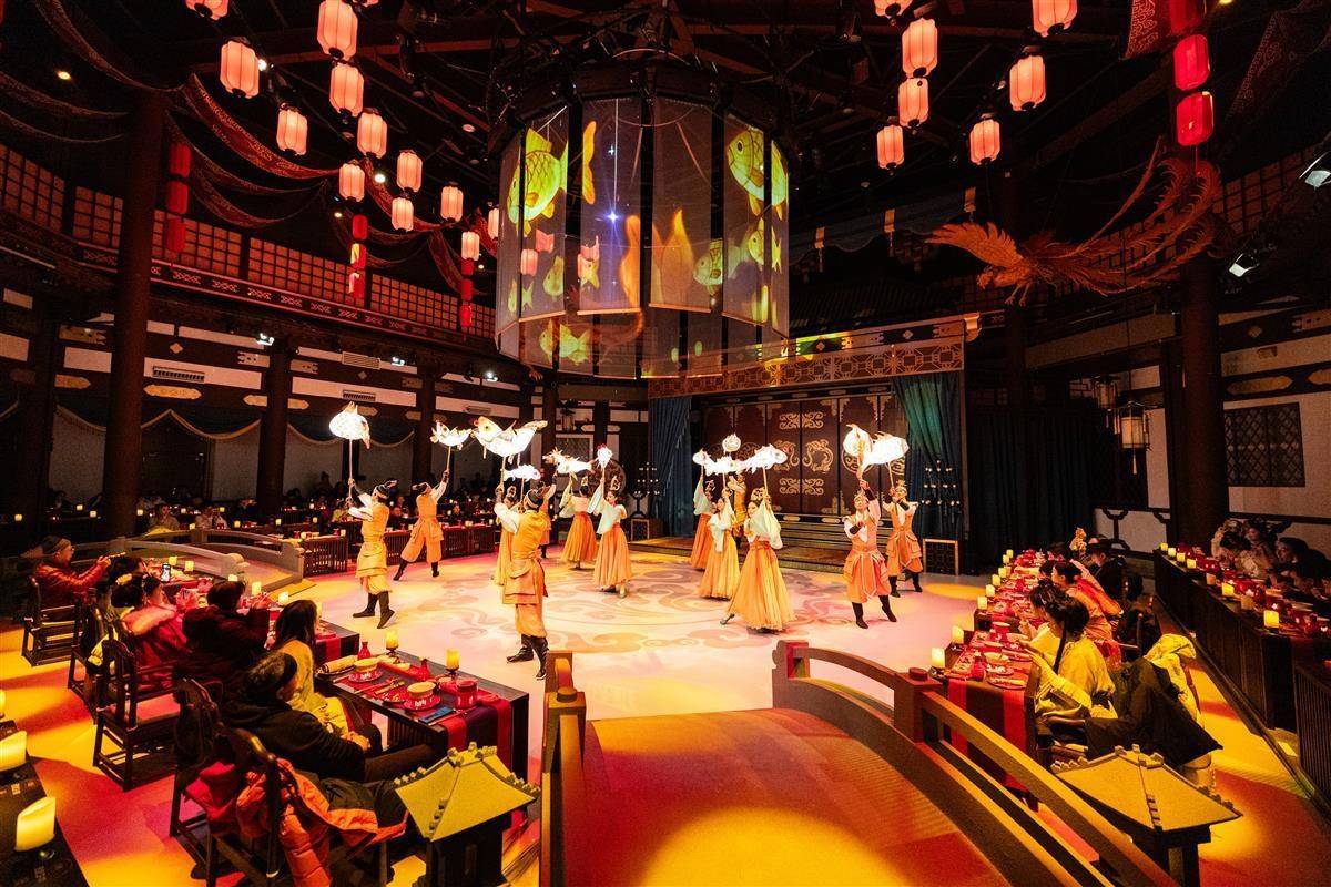 龟山知音殿本月启动试运营,推出沉浸式文化餐秀“三国群芳宴”,游客一边品美食,一边看演出。(湖北日报全媒记者 何宇欣 摄)