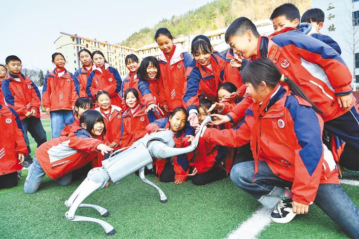 保康县后坪镇中心学校,学生与机器狗进行互动交流。(视界网 杨韬 赵硕 摄)