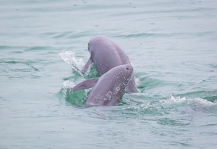 在湖北省宜昌市江边,长江江豚在水中嬉戏(2021年5月10日摄)。(新华社发)