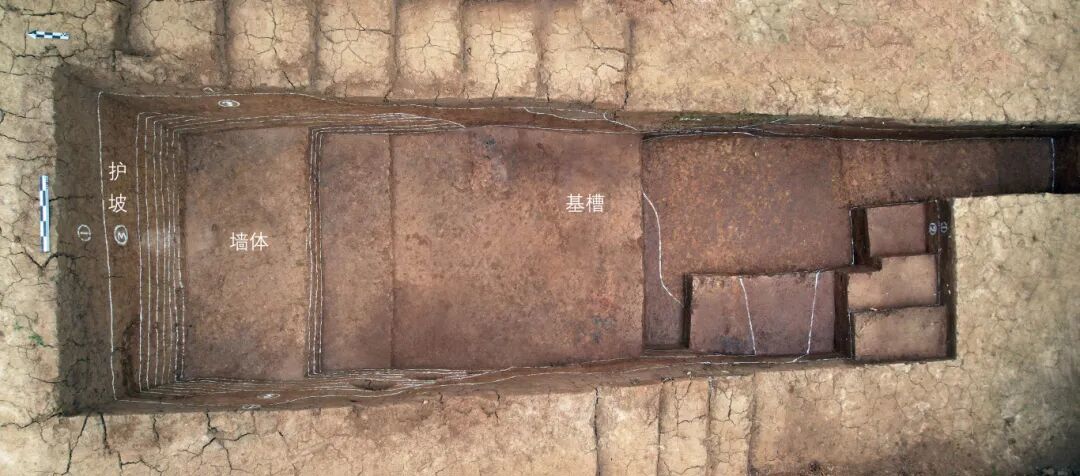 城垣保存状况较好,墙体下发现祭祀用牲遗迹,反映了筑城时的仪式活动;墙基槽采用分段夯筑工艺,表面经高温烘烤处理,大幅提升了结构的稳定性与坚固性。