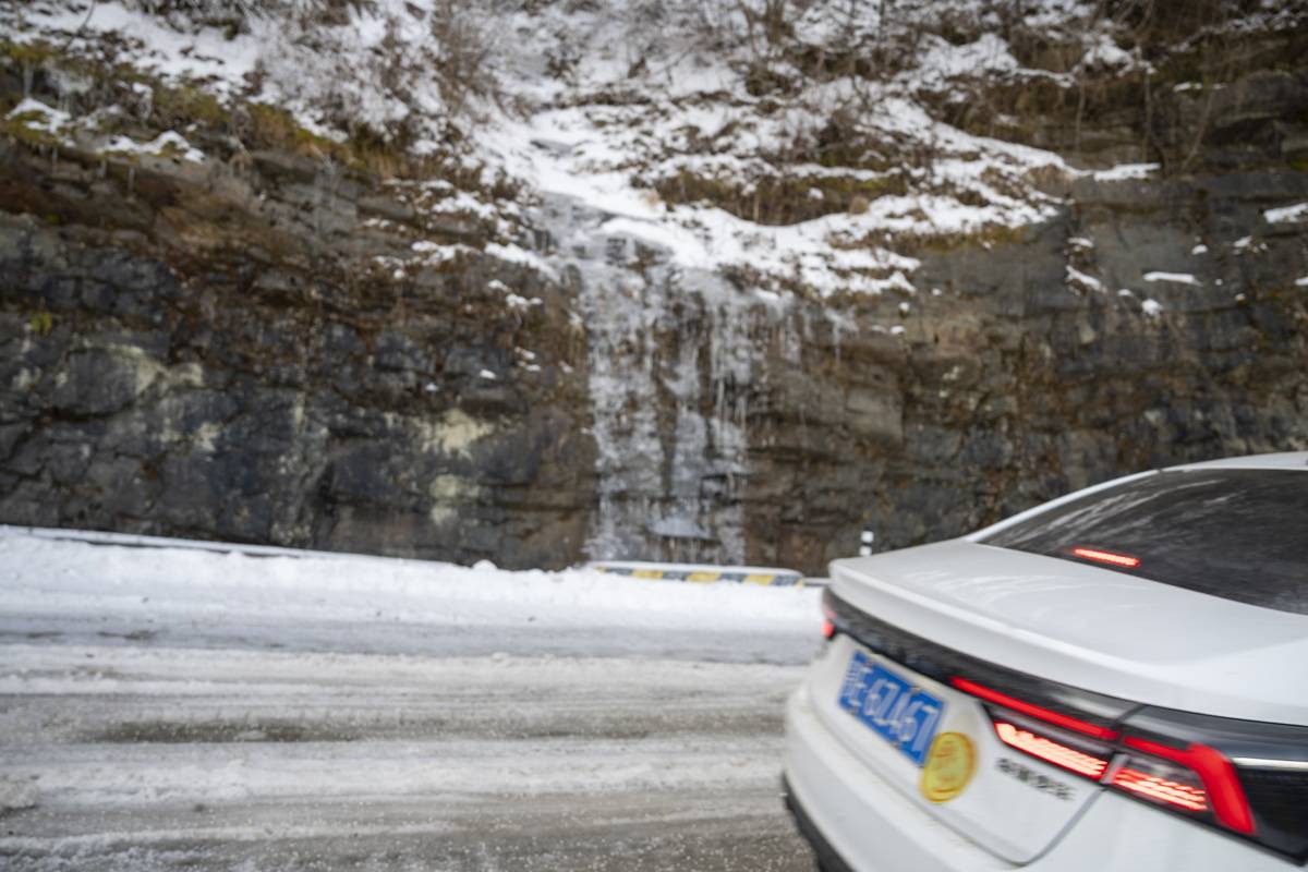 一小时后,阳光落在路边大树上,雾凇渐渐消融,晓峰垭背阴处依然寒气逼人,山崖上的冰瀑岿然不动。一位路过司机远远停车,步行前来询问情况,得知冰凌路段并不长,才开着车小心翼翼通过。