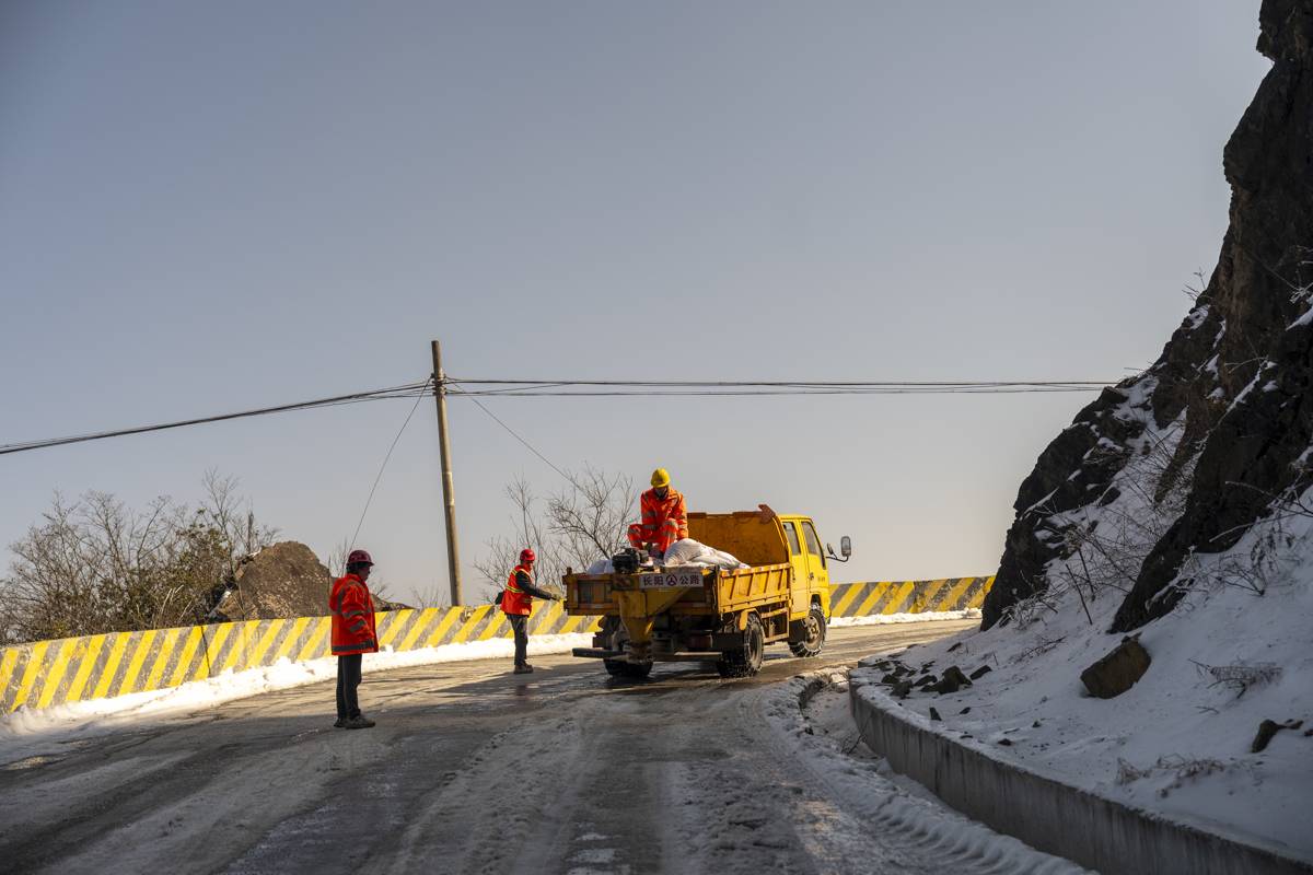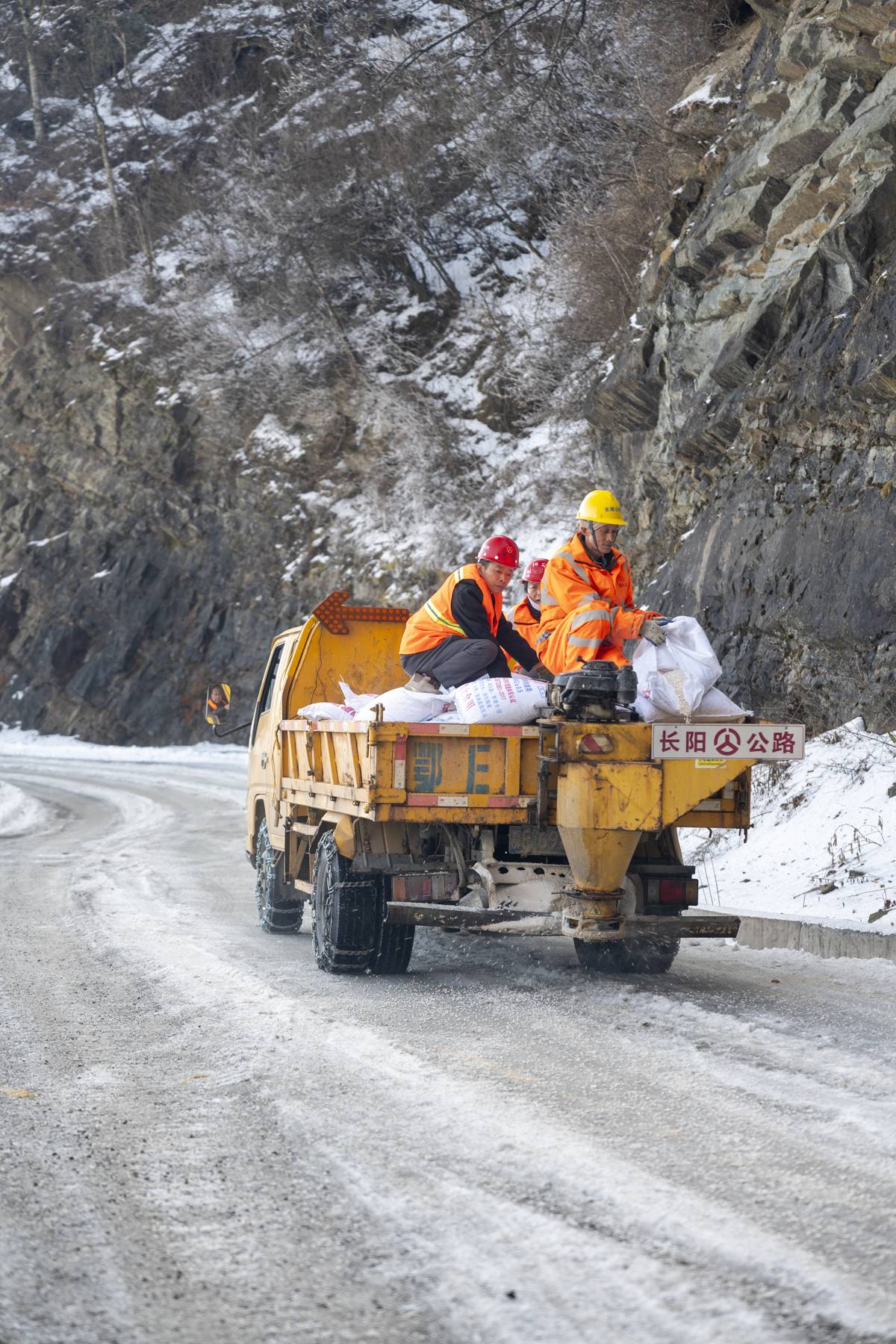 车行约8公里,晓峰垭段到了,地面残雪和融雪后的冰凌,在路面上积了厚厚一层。胡士鹏开车缓缓前行,两名同事在车上配合,通过撒布机将融雪剂均匀地抛洒到路面上。