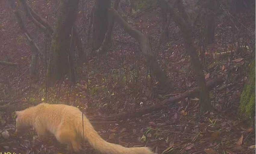 最具画面感的一幕,当数它觅食后的漫步场景。镜头清晰定格:抬步缓缓前行,蓬松的尾巴自然摆动,雪白的身躯在林间光影中移动,步伐从容不迫。行至一片茂密灌丛前,微微驻足环顾四周,随后迈着轻快的步子走向林间深处,身影渐渐变得朦胧,最终悠然淡出镜头,只留下满屏治愈与惊喜。值得一提的是,其活动状态、觅食行为均与正常果子狸无异,健康状况良好。