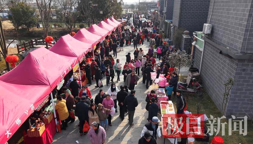 在金岭村,游客们手持福字、春联等道具,在农田里拍摄“新春耕读图”,还原传统春节祈福场景;蒙着眼睛在五谷杂粮中分辨小麦、稻谷,抢答“腊月二十三,糖瓜粘”等春节农谚,现场笑声不断。非遗传承人现场指导游客们制作汉绣福袋,将对新春的期许绣进小巧的福袋中。“这样的体验太有意义了,既感受到了传统年俗的魅力,又学到了非遗技艺。”来自孝感的游客王女士展示着自己的作品说道。