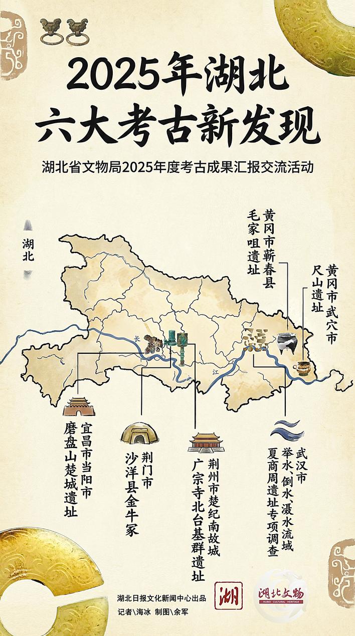 对照长江在湖北的走势图惊喜地发现,2025年湖北六大考古新发现沿着长江一路铺展开来。