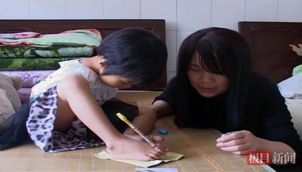刘德芬在辅导一名无臂儿童用脚趾写作业。(视频截图)