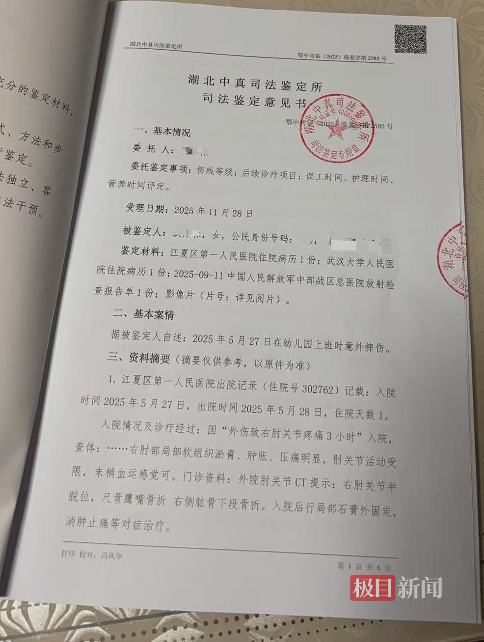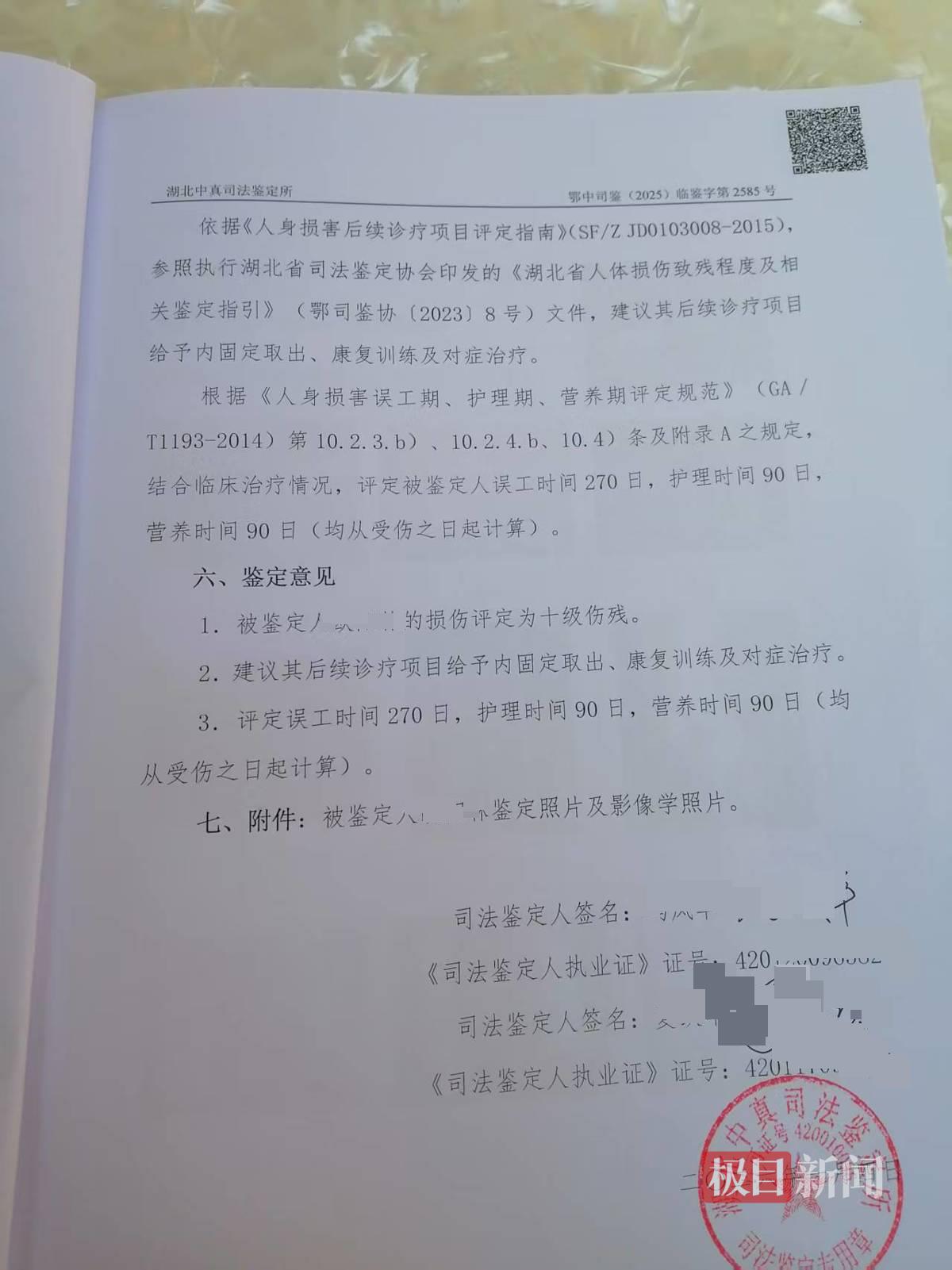 2025年11月28日,经江夏法律援助中心协助,欧阳女士在湖北中真司法鉴定所完成鉴定。2026年1月,该所出具的鉴定结果显示为“十级伤残”。