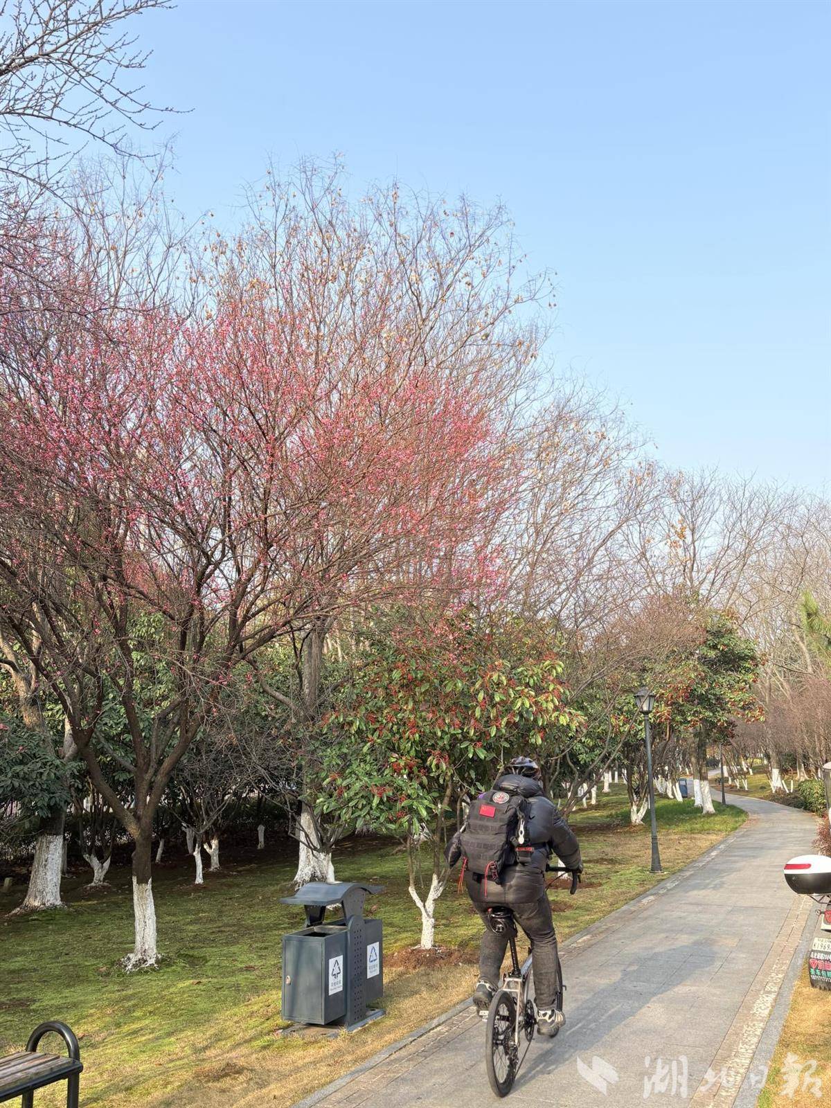 与此同时,位于景区南岸小森林区域的190株美人梅也渐次盛放。这片梅林背靠梅子山,形成了一条长达300米的梅花小径,粉白相间的花朵如云似霞,远远望去仿佛一片粉白瀑布,吸引不少游人驻足。据悉,这些美人梅栽植于2013年,花期预计可持续至三月。游客可从月湖天然水上乐园门口绿道进入,左转即可步入这条蜿蜒的梅香小径。