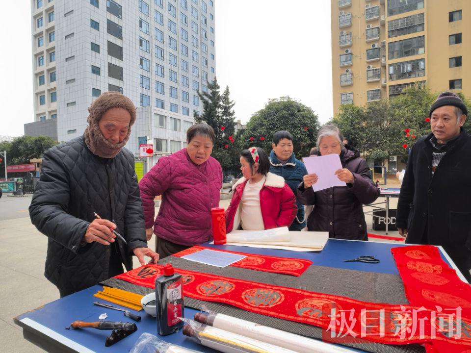 咸宁职业技术学院书法志愿者魏碧波、何赤军一口气书写50余副,边写边笑说:“看到文艺被需要,大家领春联乐开了怀,自己比吃蜜还甜,一切付出皆值得。”