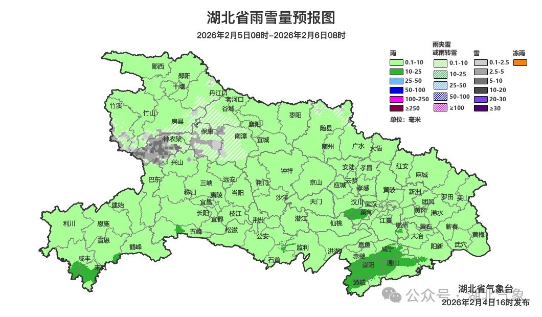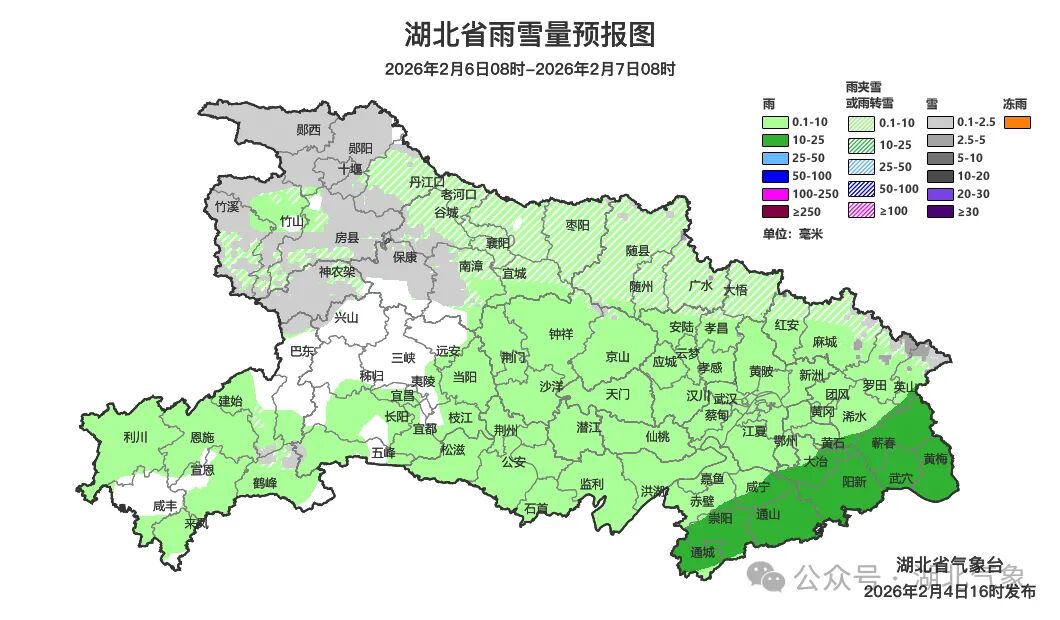 2月6日8时-7日8时,鄂西北、鄂西南北部、鄂东北北部阴天有小雨或雨夹雪,中高山区有小到中雪;其他地区阴天有小雨,鄂东南中雨。最高气温北部3~9℃、南部9~12℃,最低气温-1~5℃,偏北风4到5级、阵风6到8级。