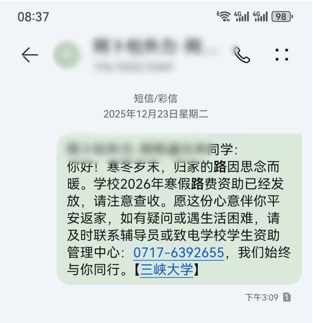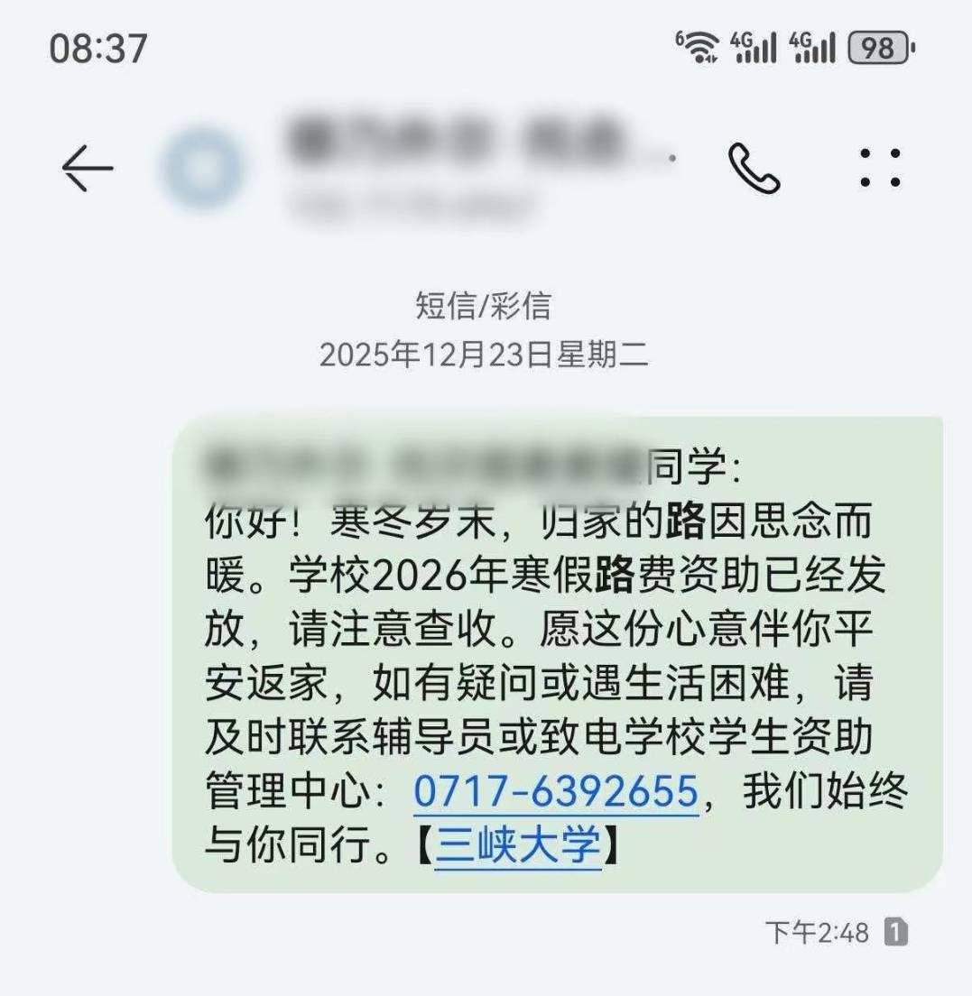 2026年春节来临之际,针对寒假学子返乡需求,三峡大学启动了路费资助计划,为85名困难学生精准发放路费资助金87100元。“根据返乡路程远近,每人资助600元至1500元不等,解决学生回家难问题。”三峡大学学生处资助中心王春娥介绍。