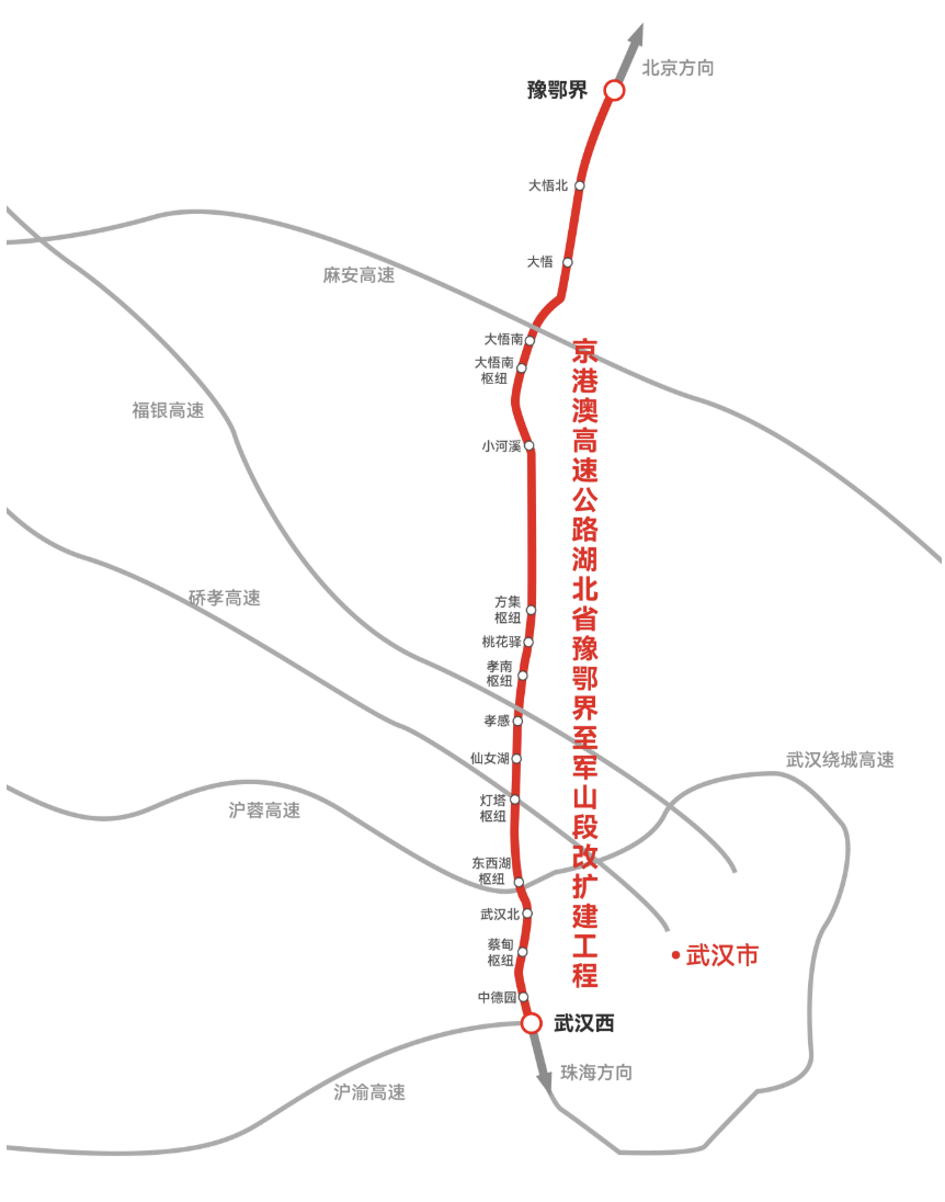 京港澳高速湖北北段改扩建工程,是国家“十四五”重点工程和交通强国示范项目。该项目起于大悟县九里关(豫鄂界),经孝感市大悟县、孝昌县、孝南区,武汉市东西湖区、蔡甸区、武汉经济技术开发区,止于武汉西枢纽互通,接京港澳高速公路和沪渝高速公路共线段,全长157.79公里。