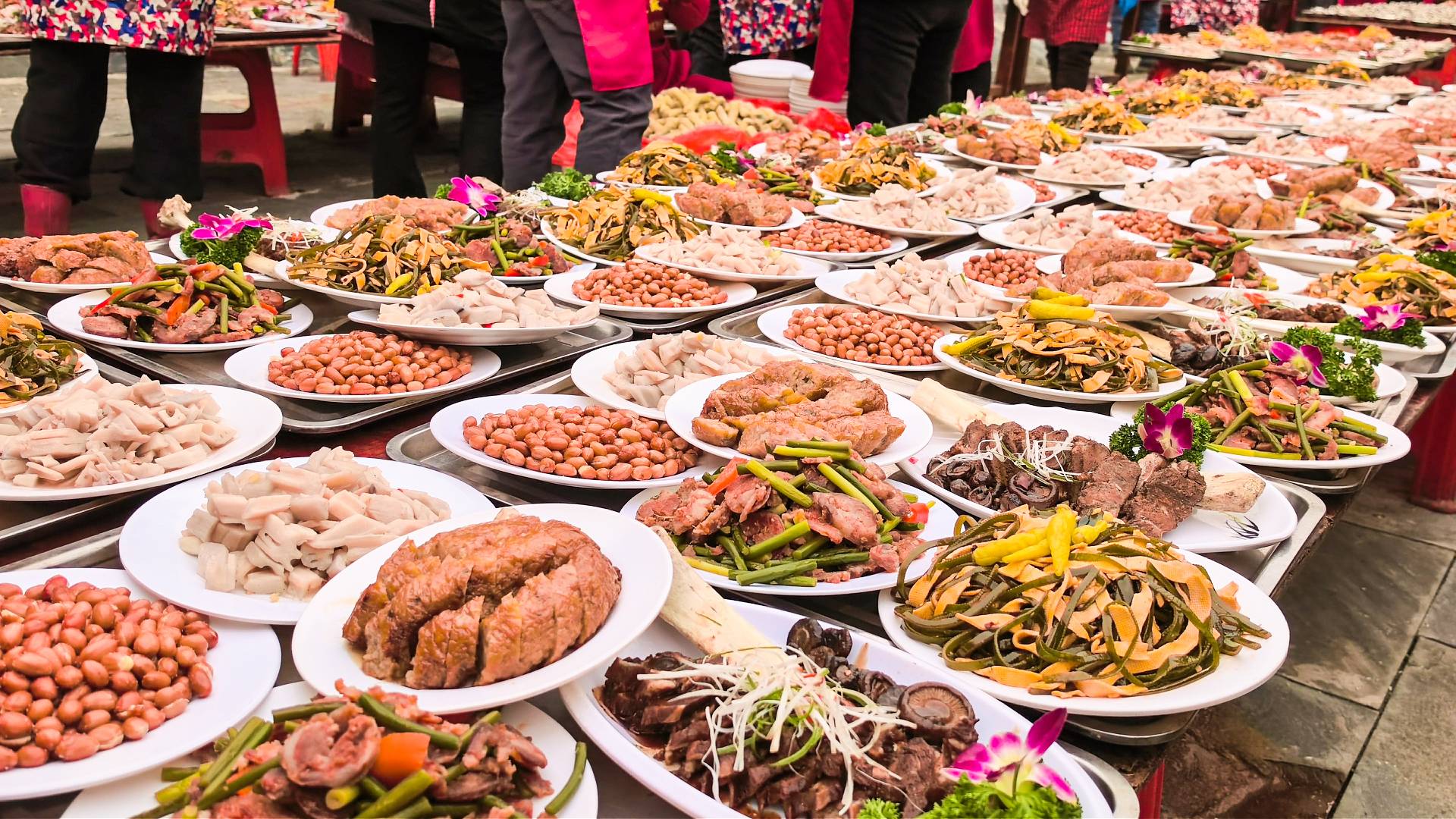整场活动中,最令人期待的莫过于那场声势浩大的团圆盛宴。中午时分,180张长桌整齐排列,场面十分壮观。桌上摆满了曾侯乙蒸牛肉、泡泡青、非遗喜饼等地道随州美食,每一道菜都承载着浓浓的年味儿与家乡记忆。