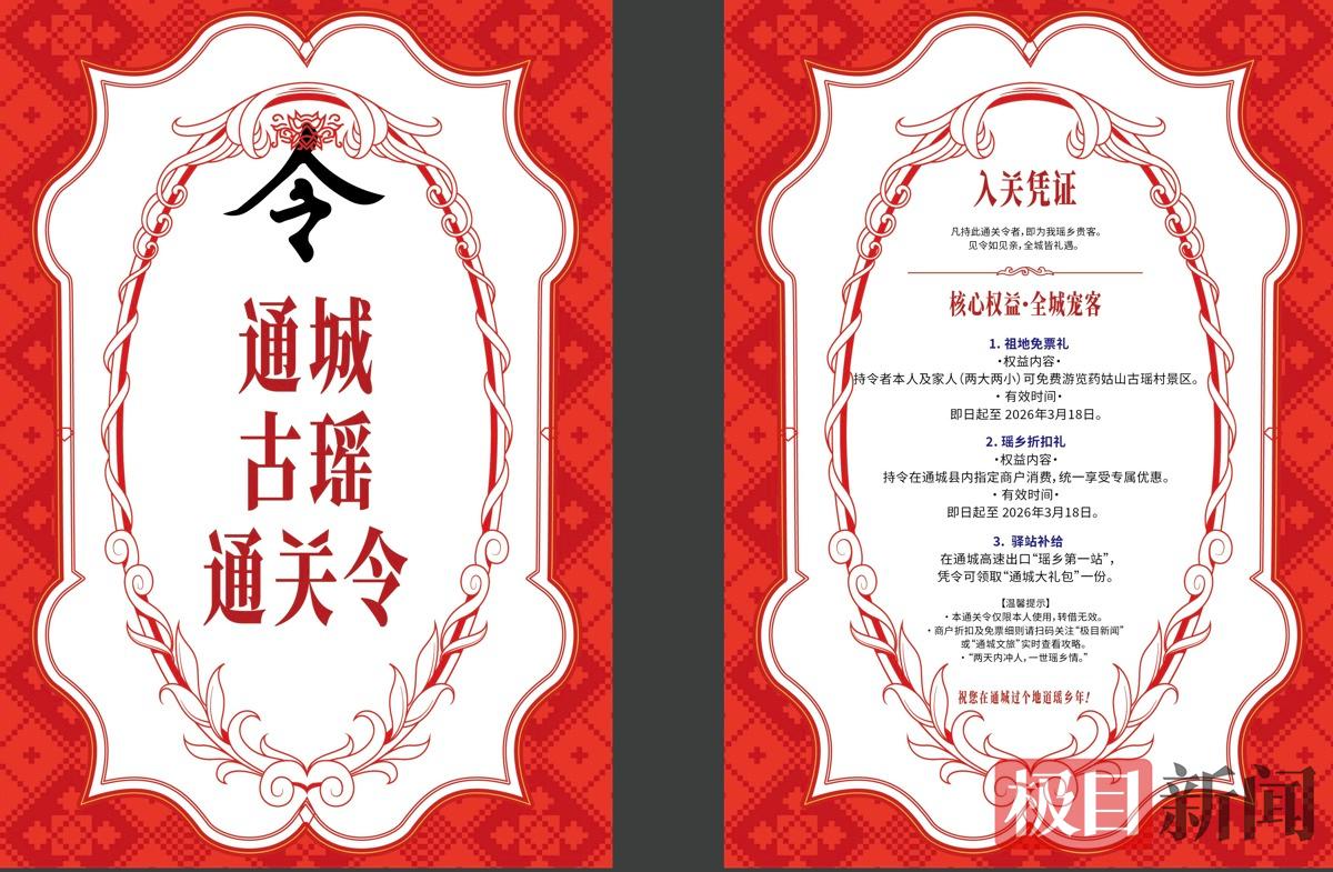 据高俊杰介绍,过年期间,为回馈游客,通城县还诚意推出了1000份“古瑶通关令”,下高速口即可在服务点领取。这不仅是一份具有收藏价值的文化文牒,更是通城献给游客的一份“宠客大礼包”。凡持有“古瑶通关令”的游客,可尊享全县所有收费景区(含药姑山古瑶村、高冲公社等)大门票全免的特权。同时,全县涵盖餐饮、住宿、特产的金牌商户已集结完毕,承诺为持证游客提供统一8.8折的专属优惠。该政策将从即日起持续生效至3月18日,旨在通过“全城免票、全城让利”,邀请全国游客来通城过一个最有诚意、最地道的瑶家年。