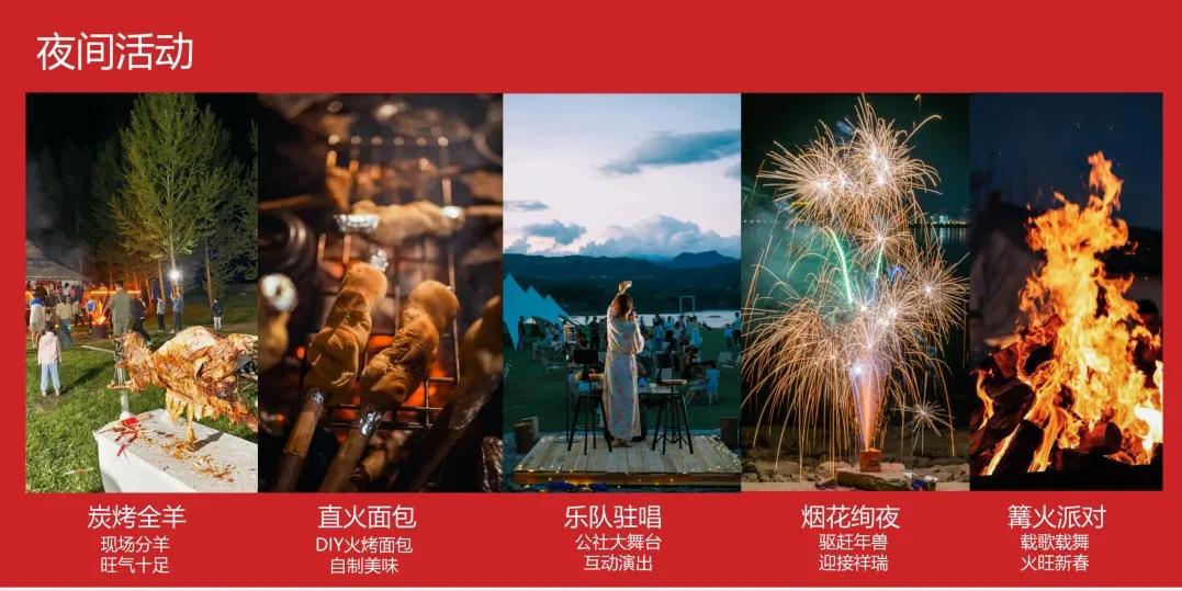 一萝好运、投壶、踢毽子、瑞福纳祥、蹴鞠、集五福、磨多福、黑市摇骰子、乐队驻唱、篝火晚会、烟花绚夜、嗑瓜子大赛。