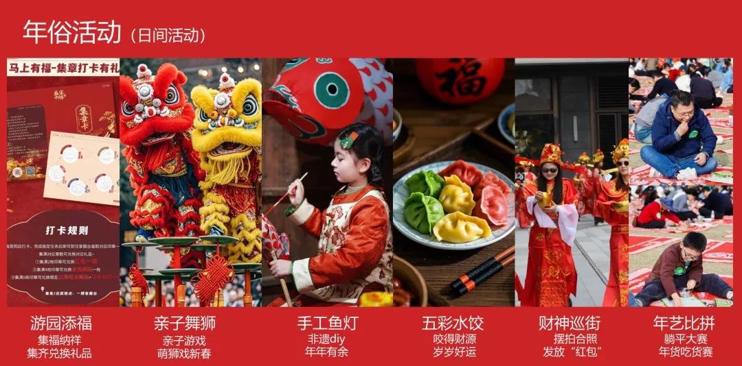 一萝好运、投壶、踢毽子、瑞福纳祥、蹴鞠、集五福、磨多福、黑市摇骰子、乐队驻唱、篝火晚会、烟花绚夜、嗑瓜子大赛、五彩饺子、制作鱼灯、皮影戏、舞狮。