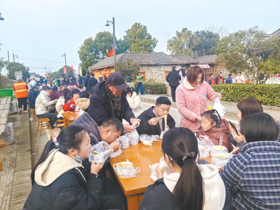 沉浸感受年味盛宴,探索多元新春乐趣。当日重头戏当属品尝郑场地道十大碗,分时段提供120桌团圆宴席,市民游客凭券入场,千人围坐热闹开席。粉蒸肉、粉蒸排骨、炸肉丸……一道道诱人佳肴端上餐桌,宾客围坐,共享美食之乐。“看表演、尝美食、买年货,乡村年味很地道。”市民杜豆特意提前一天从城区过来,点赞“值得来”。市民别倩和闺蜜吃完十大碗,又去古街上拍照,这是她们第二次来渔泛古村参加新春游园。