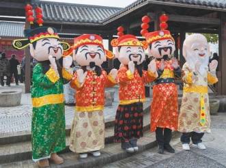 逛新春游园会,漫步古街石板路,儿时年味记忆被“唤醒”。卡通形象的“福禄寿喜财”人偶颇为显眼,吸引大家参与互动。
