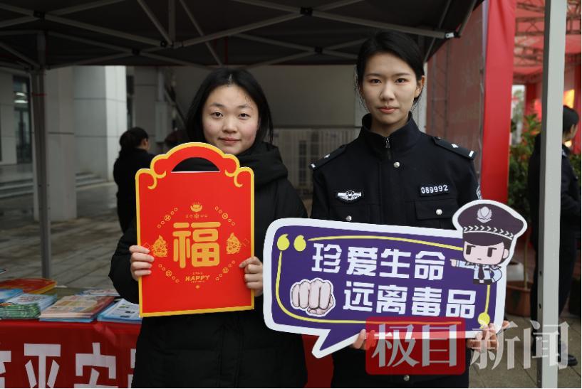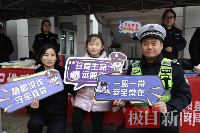 “瞧一瞧、看一看啦!反诈要领须牢记,陌生链接不要点……吸毒一口,掉入虎口,莫沾毒品,莫交毒友……开车不喝酒,喝酒不开车……”民警现场普法的声音在人群中不间断响起,通过设置宣传展板、发放宣传资料、现场解答疑问等形式,向群众普及防范电信网络诈骗、交通安全、禁毒等法律知识,群众纷纷驻足,认真聆听讲解。