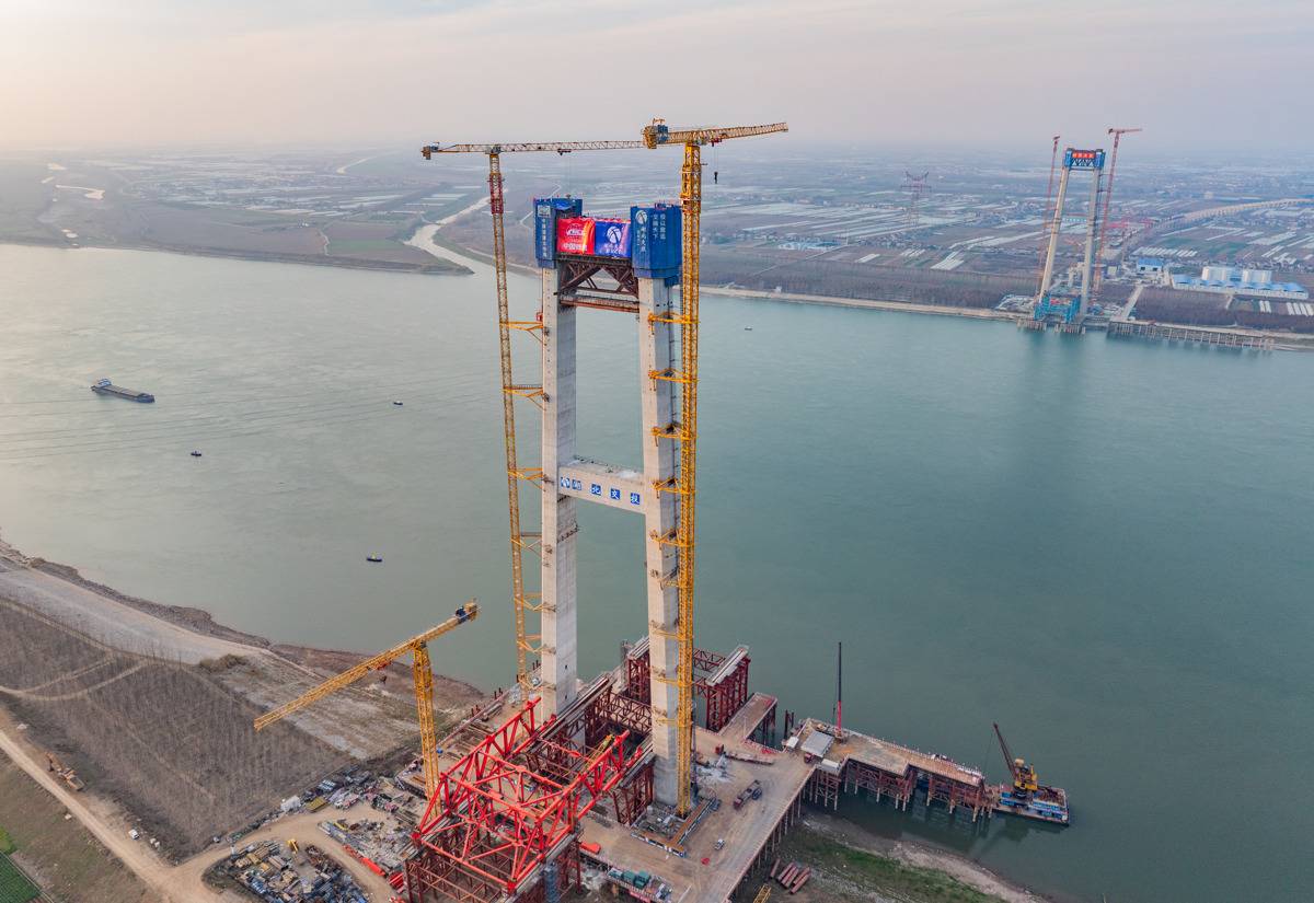 荆州李埠公铁长江大桥两岸主塔封顶。(湖北日报全媒记者 柯皓 摄)