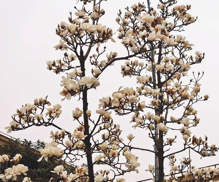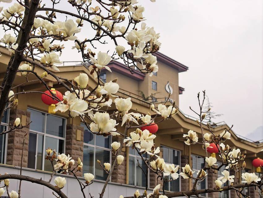 当日上午,笔者刚走到昭君山庄门口,便被眼前这几株盛开的玉兰吸引。满树的玉兰花,有的含苞待放,娇羞欲滴;有的则完全舒展,宛如一只只停歇在枝头的白鸽,洁白素雅,散发着淡淡的清香。枝头繁花与山庄建筑相映成趣,更有鲜红的灯笼点缀其间,春节的喜庆气氛与早春的生机盎然完美融合。