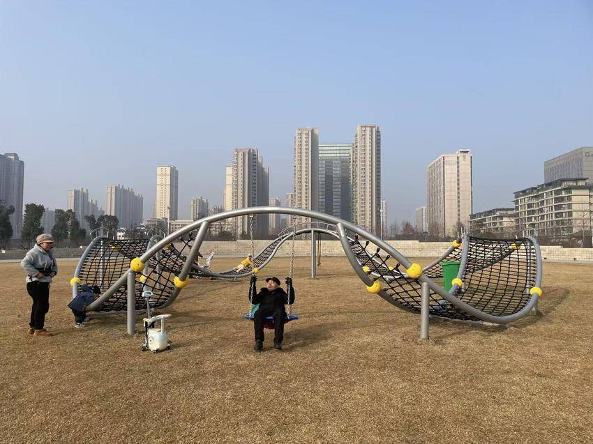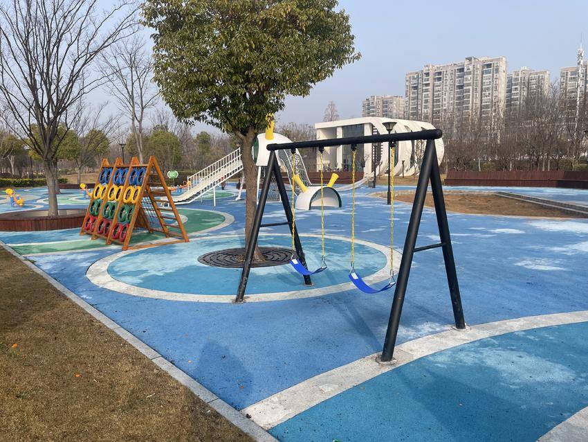 在公园原有廊架基础上,增设童趣秋千、趣味攀爬架、安全爬网及广场互动地灯,同步配套休憩座凳与清晰的安全指示牌,兼顾家长休憩与儿童轻运动需求,让亲子时光更具温度。