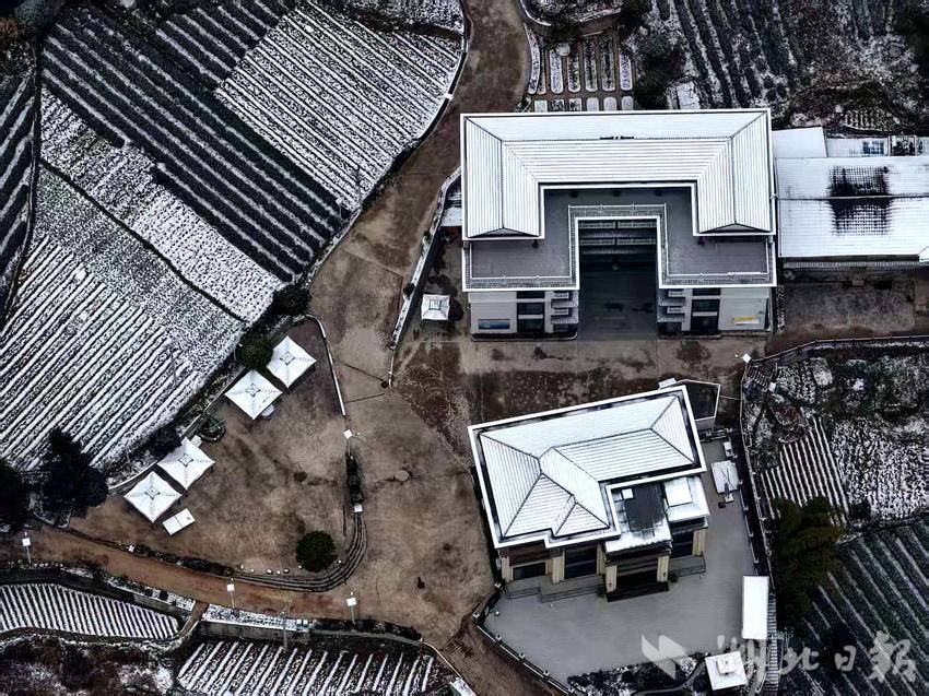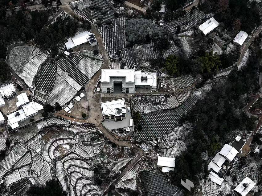 从空中俯瞰,错落的民居、层叠的梯田与澄澈的水塘在雪色中交织成一幅冬日画卷。田埂如大地的脉络,在白雪的勾勒下更显清晰;黛瓦白墙的民居错落有致,与银装素裹的树林相映成景。新北辰康养旅居基地和心形观景台坐落于山林之间,半覆白雪,为静谧山野增添了别样景致。