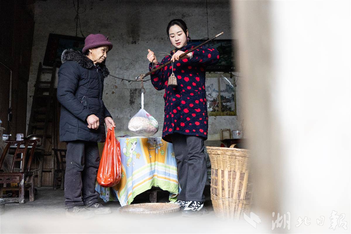 2026年2月3日,在湖北省恩施土家族苗族自治州恩施市的芭蕉侗族乡,谢海艳在村民家中收货。(湖北日报全媒记者 何宇欣 摄)