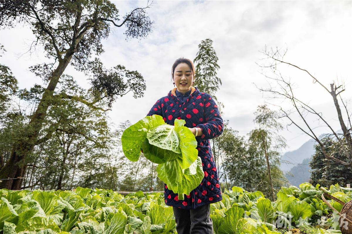 2026年2月3日,在湖北省恩施土家族苗族自治州恩施市的芭蕉侗族乡,谢海艳在菜地里收割新鲜的大白菜。(湖北日报全媒记者 何宇欣 摄)
