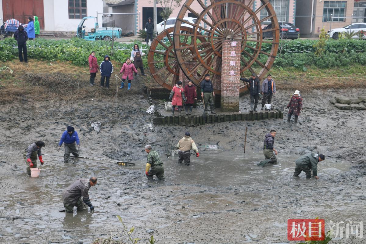 2月9日,湖北省江陵县六合垸管理区三马湖社区的“共享鱼塘”热闹非凡,11户居民早早来到这里,等待着一年一度的丰收时刻。