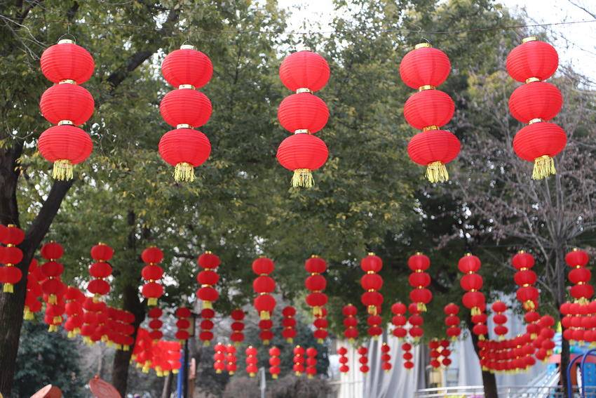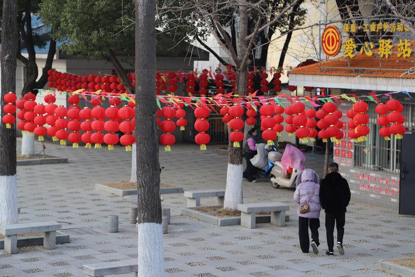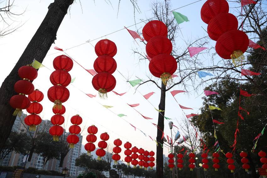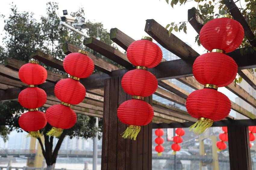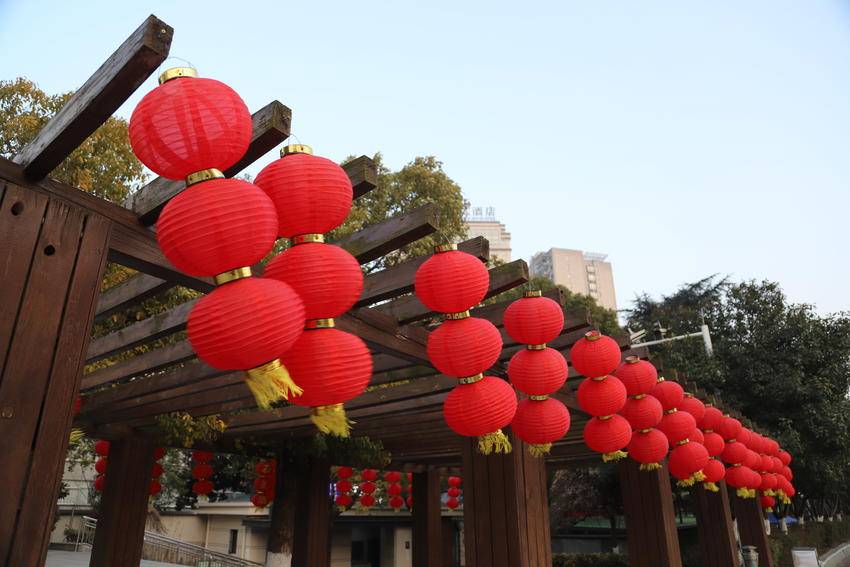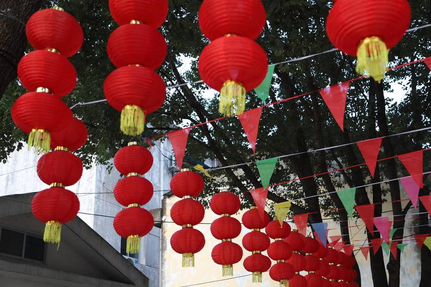 枝繁叶茂的树木间,串串红灯笼似玛瑙缀满枝头,三三两两成组的灯笼垂挂而下,金黄流苏随风轻摆,与彩色三角旗交织出灵动的韵律;木质廊架上红灯笼整齐列队,与周围幢幢高楼相映成趣。