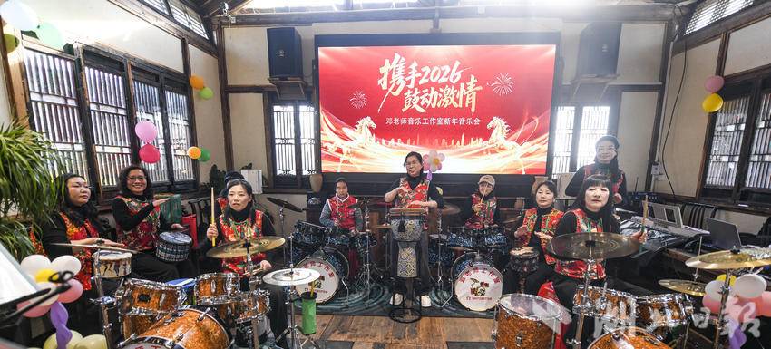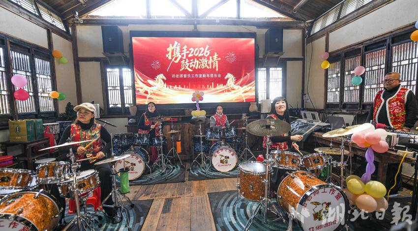 在河塘木屋里,邓老师音乐工作室演奏的2026华章《音为热爱,声生不息》、架子鼓表演《赛马迎马年》、电吹管演奏《荷塘月色》,丝竹悠扬,管弦和鸣,游客们一边欣赏优美的旋律,一边品尝以野藕为特色的农家菜。