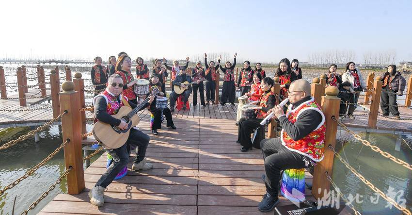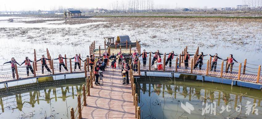 湖北日报客户端讯(通讯员雷平)2月8日,位于嘉鱼县新街镇王家月村的嘉野生态农业有限公司湖地野生莲藕种植基地,游客欢聚,鼓乐齐鸣,共迎新春。