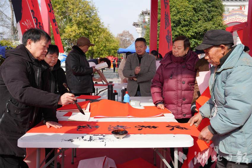 写春联、品年食、赶大集,活动现场年味拉满。年俗体验区内,村民们挥毫泼墨,红底黑墨间写下一副副寓意吉祥的春联;美食区里,米豆腐、油粑粑、炸酥肉等地道土家年食香气扑鼻,市民游客驻足品尝,“赶年集”摊位前更是人声鼎沸,西兰卡普、来凤藤茶、土家蜂蜜、凤头姜等特色好物悉数亮相,游客们争相选购,在感受年味的同时,带走属于来凤的土家风味。