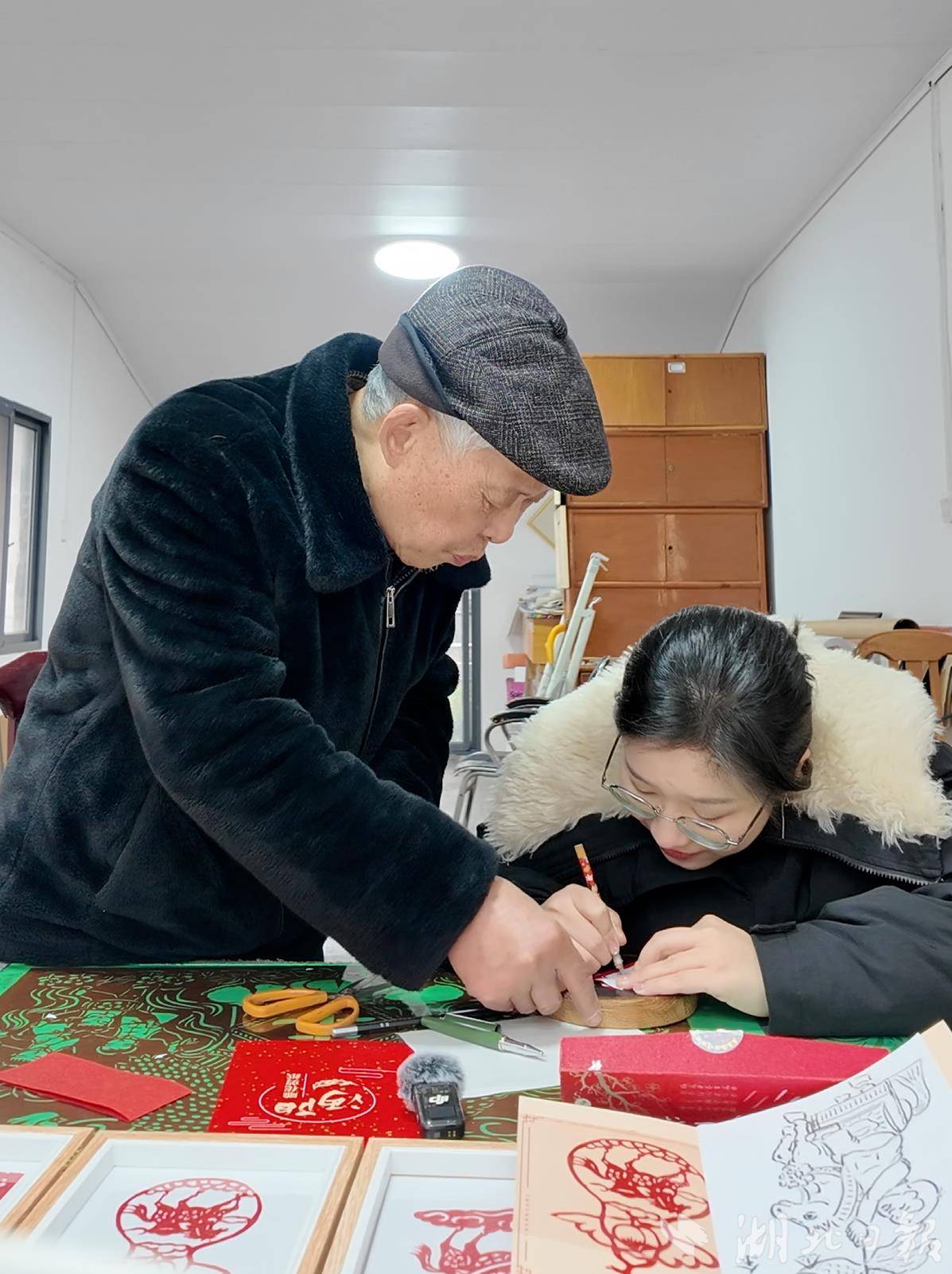 临近春节,仙桃市剪纸学会的活动也多了起来,他们将寓意吉祥的剪纸作品带到社区、火车站、学校,把新年祝福送进千家万户。