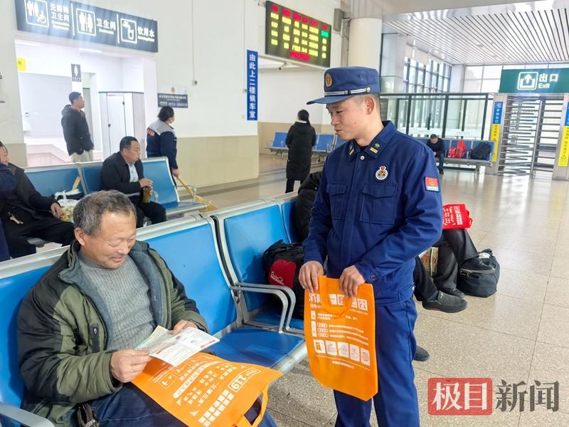 “候车时请注意安全出口位置,遇突发情况请冷静有序疏散。”“离家前牢记‘三清三关’,做到人走关火、出门断电。”在孝感火车站,消防宣传人员与车站工作人员组成宣传小分队,穿梭于候车厅、检票口等人流密集区域,结合春运实际,用亲切的方言讲解出行与居家防火知识。旅客们纷纷驻足聆听,主动咨询家庭用火用电、初期火灾扑救等常见问题,宣传人员逐一细致解答,让安全知识在交流中深入人心。