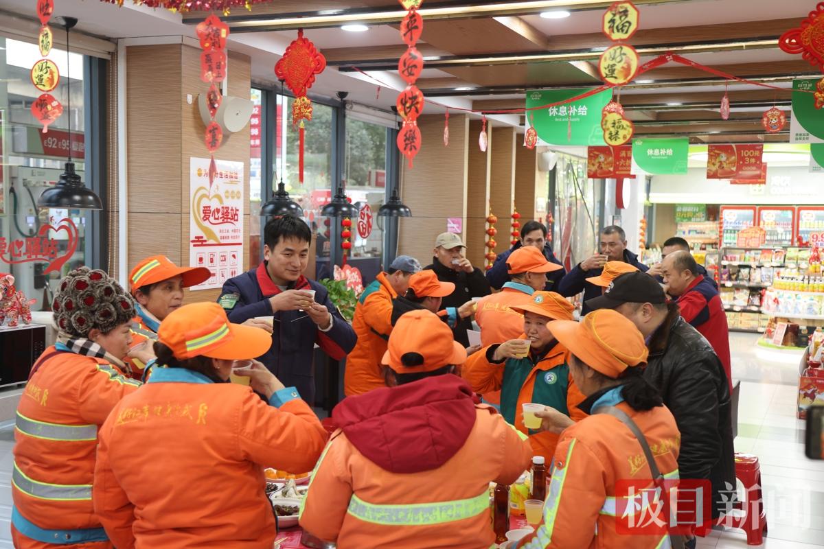 在武汉中国石化头道街加能站“爱心驿站”内,红灯笼、福字点缀其间,年味十足、暖意融融。两张团年饭餐桌上,摆满了地道湖北风味菜肴:来自潜江的小龙虾寓意“红红火火”,醇厚鲜美的排骨藕汤寄托“好运连连”,鲜香入味的鱼头泡饭祝愿“鸿运当头”,还有珍珠圆子、沔阳三蒸、腊肉炒菜薹等特色菜品,搭配清润双柚汁和醇香青砖茶,每一道菜都承载着团圆的祝福。20余名卡车司机、环卫工人、网约车司机围坐桌边,举杯互祝新春,欢声笑语中,连日奔波的疲惫悄然消散,陌生的距离也渐渐拉近。