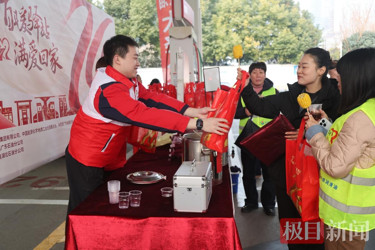 记者在武汉中国石化头道街加能站现场看到,加油岛旁的“春运爱心服务台”格外醒目,保温桶内的姜茶、八宝粥、热玉米等便民餐食热气氤氲、香气扑鼻,几位等候加油的车主围站台前,手捧热饮驱寒暖身,脸上满是笑意。“今天准备开车回老家,孩子肚子有点饿,刚下车志愿者就送上了热玉米和姜茶,太贴心了。”车主殷女士感慨道,一句句问候、一份份热食,让返乡路上的疲惫消散大半,也感受到了满满的社会关爱。