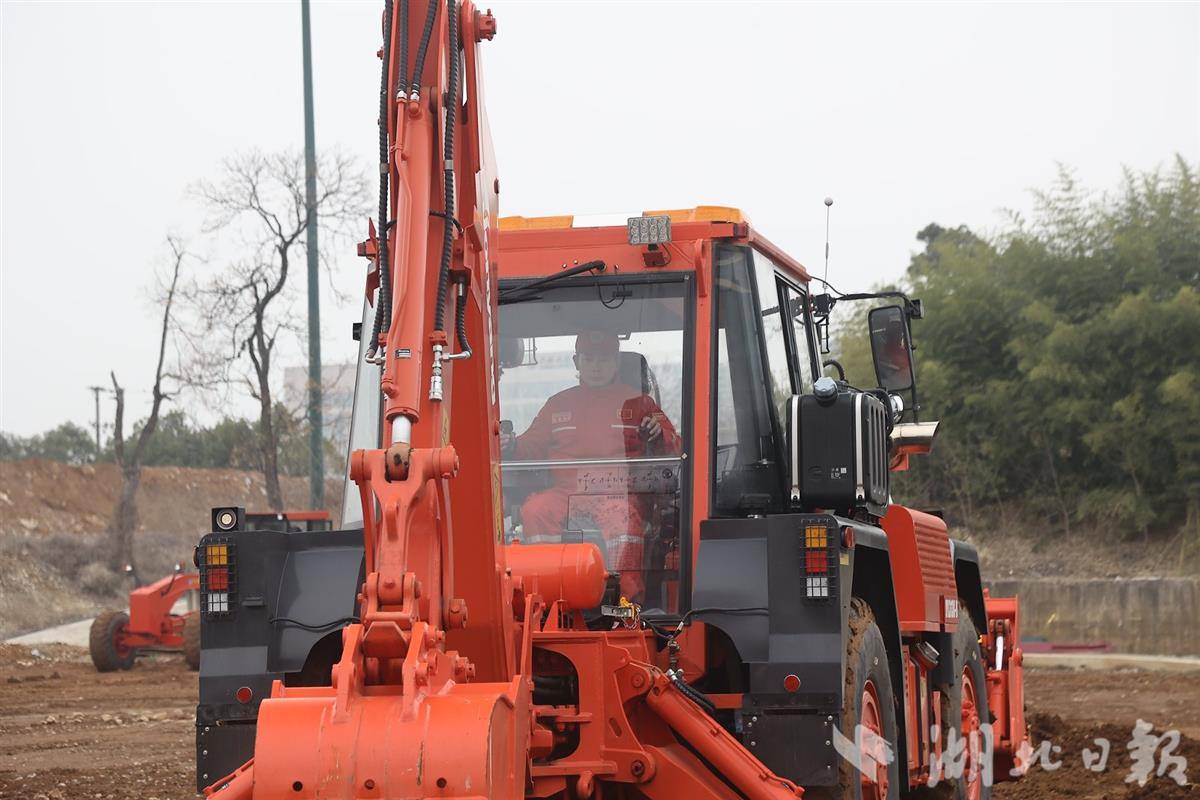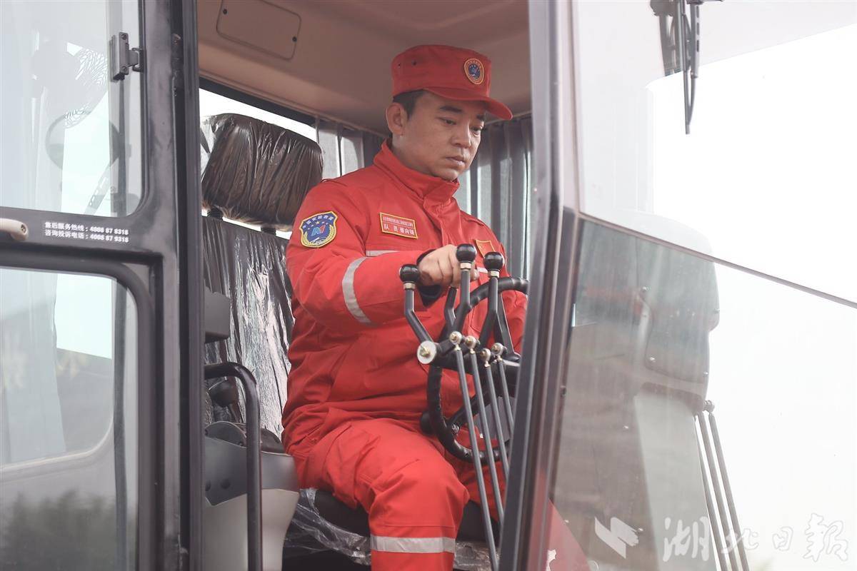 不远处的另一块场地上,41岁的张涛正在操作高速轮式多用工程车。只见他在驾驶室内熟练旋转座椅,瞬间从前方的铲车操作模式切换到后方的挖掘机操作界面。这个来自十堰竹山的汉子,是两个孩子的父亲。孩子们在视频里看到这台多功能工程车时,满眼都是兴奋与好奇。家人的理解与崇拜,是他坚守岗位最温暖的支撑。他说,穿上这身“救援红”,就意味着在万家灯火亮起时,总要有人选择做那盏不熄的应急灯。