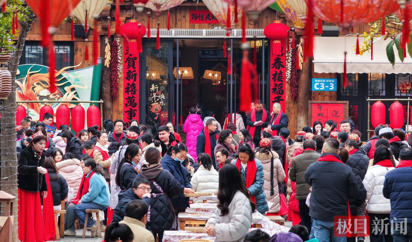 上午9时许,乔街室外场地变成热闹的传统文化体验区。热气蒸腾的糍粑缸前,各族青年在老师傅的指导下轮番挥槌,体验“同心揣福”的劳作之趣与团结之力。一旁的插花区内,女性朋友们巧手将银柳、红灯笼汇成一件件寓意吉祥的春节作品,安静雅致中流淌着对美好生活的共同向往。书法长桌前,老幼同堂,墨香四溢,一副副春联、一个个“福”字,传递的不仅是新春祝福,更是中华文化的深厚滋养与代际传承。