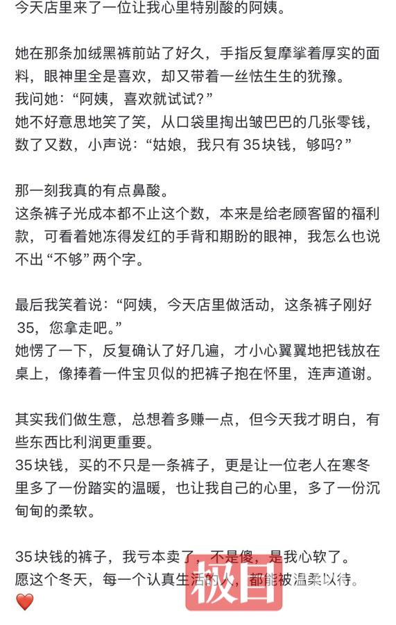 这次暖心的“交易”,没有豪言壮语,只有真心相待。老人用35元买下的不只是一条棉裤,更是普通人之间最朴素、最动人的善意。