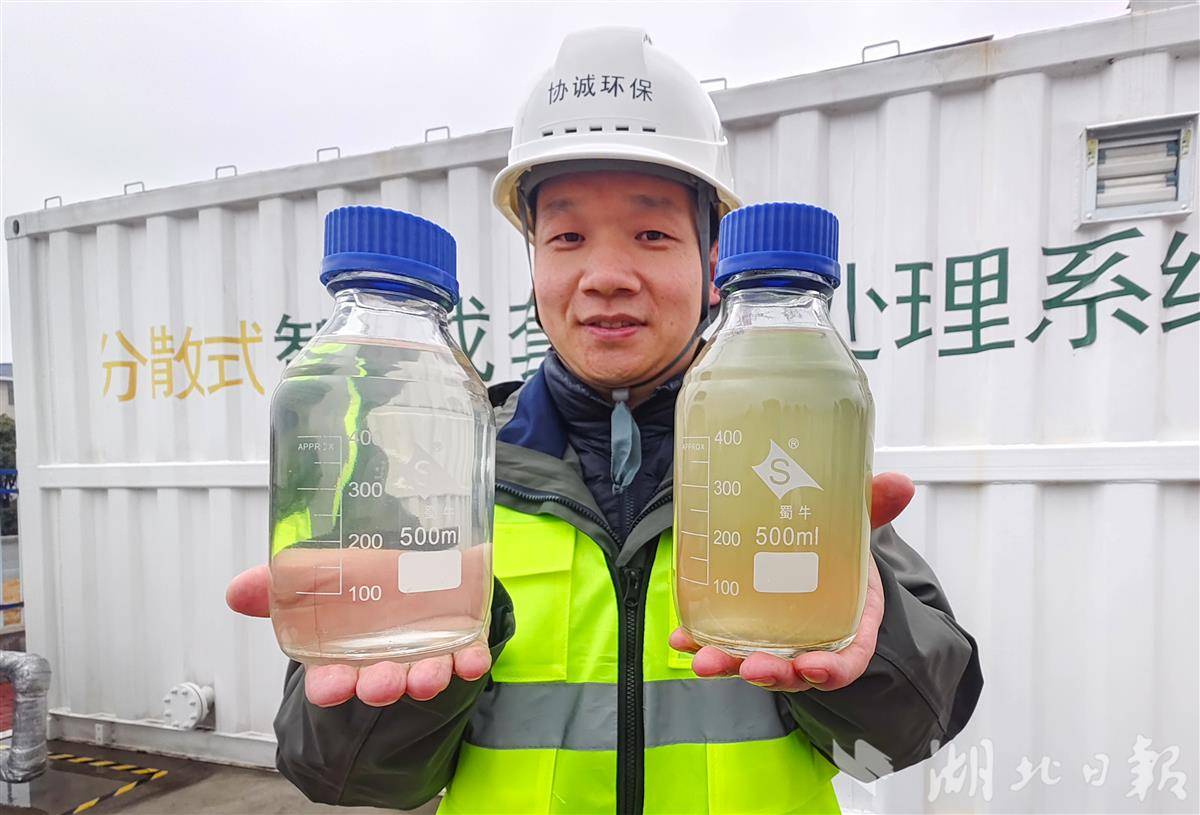 智能污水净化设施处理后的清水和污水对比(湖北日报全媒记者 柯皓 摄)