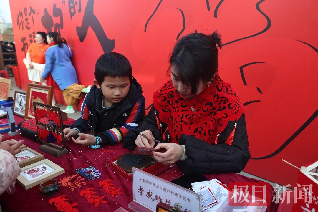 民俗街区灯笼高悬,八仙桌美食区香气扑鼻,舞狮、采莲船巡演轮番上演,孝感雕花剪纸、麦秆画等非遗项目展示引得市民、小朋友驻足体验。年味市集上,春联书写、传统年货、特色小吃摊位错落有致,孝感麻糖、米酒、炒货等美食香气四溢,勾起了大家的味蕾。