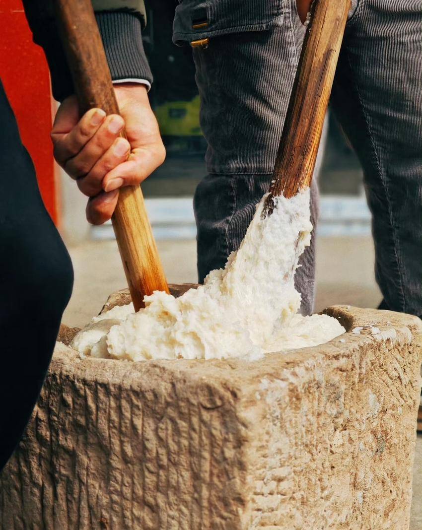 打糍粑是孝南人刻在骨子里的春节仪式。每到腊月,家家户户便选定好日子,提前备料、相约动手。选用颗粒饱满圆润的长颗粒糯米,经清水反复淘洗三遍,浸泡一整天充分吸饱水分,再放入木甑,以大灶猛火蒸约一小时。热气腾腾的糯米饭出锅,米香醇厚、软糯劲道,为打好糍粑打下好底子。
