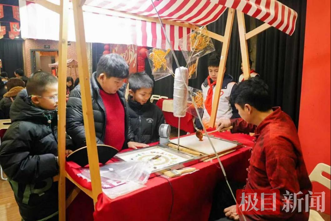 糖画体验区最热闹,这里早已排起了长队,只见非遗老师以勺为笔、以糖为墨,手腕轻转间,游龙、骏马等造型便晶莹剔透地呈现出来,引得大家啧啧称奇。拿到糖画的市民们细细观赏、慢慢品尝,感受着这份“甜蜜的非遗”。一旁的春联体验区同样暖意融融,书法老师现场泼墨挥毫,不少市民也跃跃欲试,提笔蘸墨,将对新年的美好期盼倾注于笔端,书写在红纸之上。
