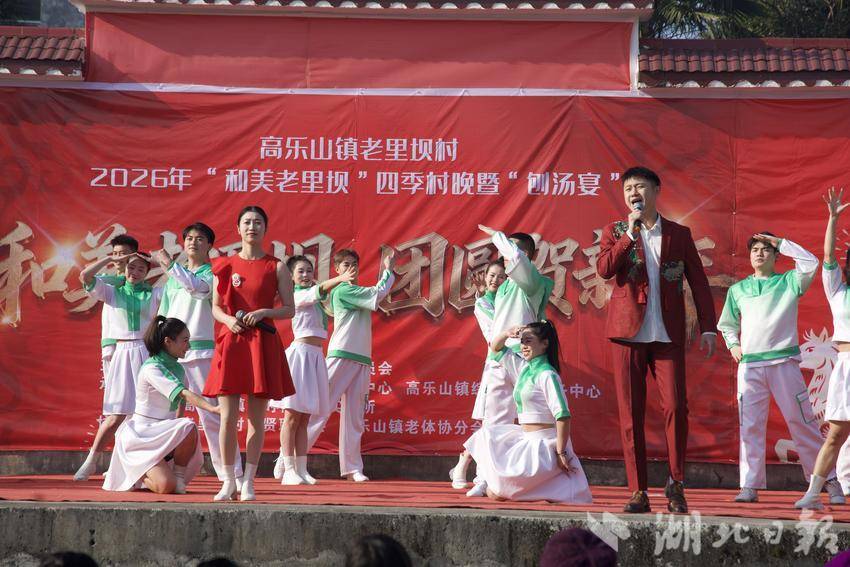 2月14日,农历腊月二十七,咸丰县高乐山镇老里坝村安置区文化广场上人头攒动,欢声笑语不断。2026年“和美老里坝”四季村晚暨刨汤宴活动在这里热闹举行。全体村民欢聚一堂,喜迎新春。