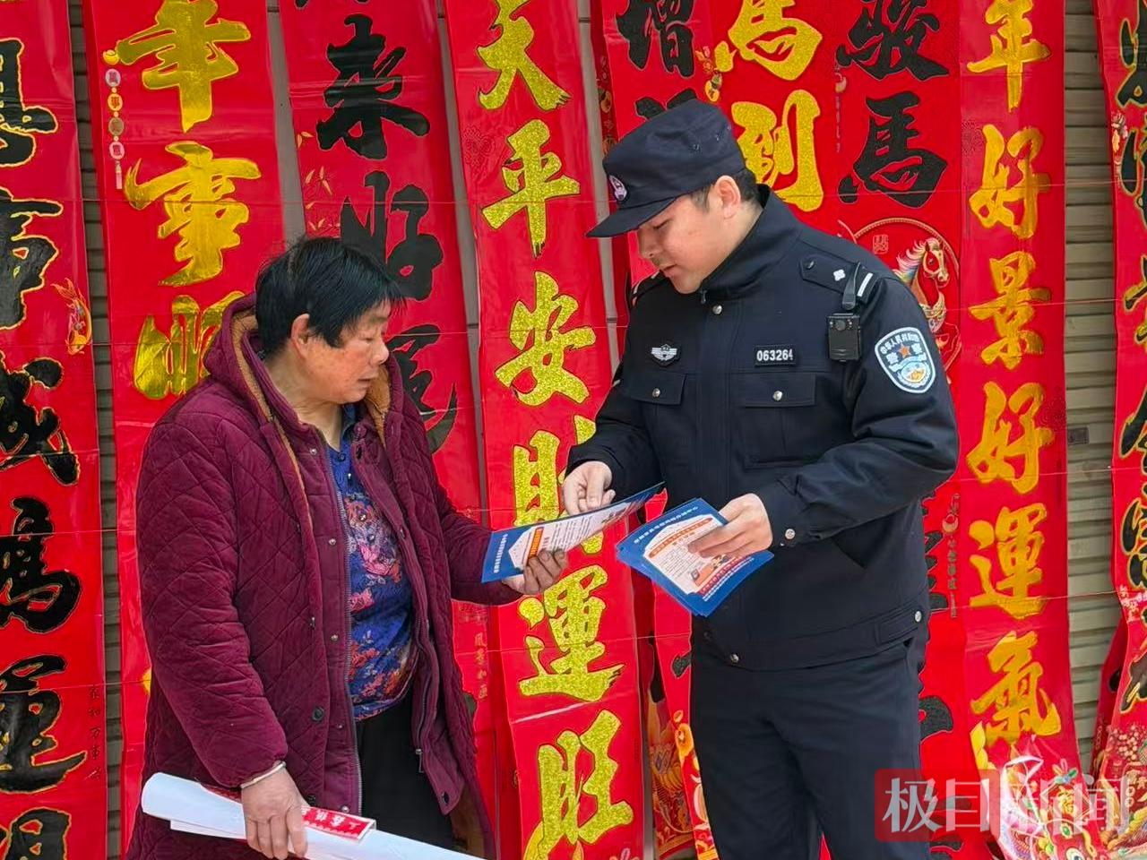 2月14日,为筑牢春节期间安全防线,湖北枣阳市公安局鹿头派出所组织民警走进集市,将防盗、反诈、消防安全知识打包成“平安年货”,精准送达赶集群众和商户手中,让藏青蓝成为节日里最安心的底色。