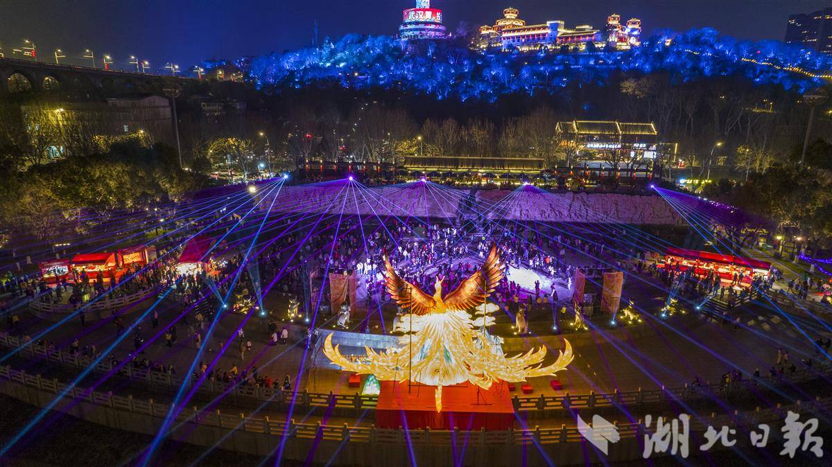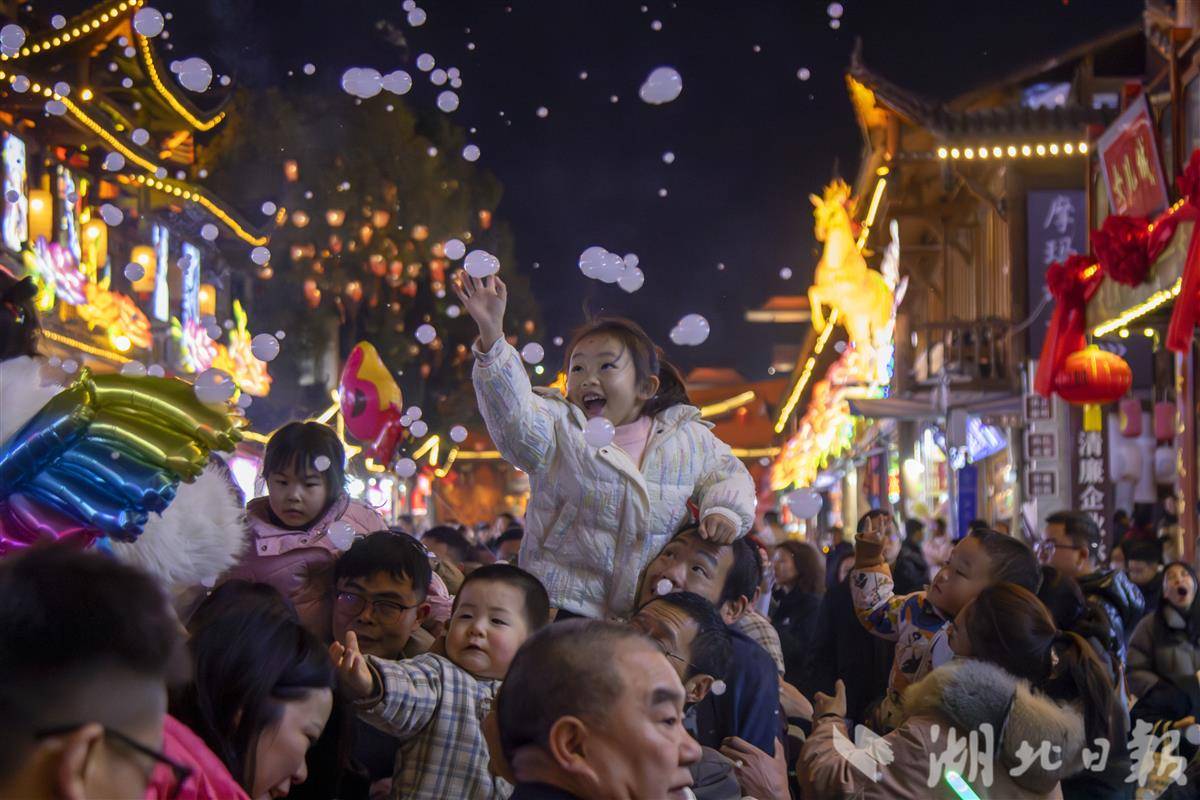 光影逐梦,喜乐满盈。龟山脚下、长江畔,灯光秀璀璨启幕,以山为幕、以光为诗,与长江大桥、电视塔交相辉映,光影流转间勾勒江城浪漫,尽显时代活力;襄阳古城小北门广场,千盏孔明灯缓缓升空,暖黄光点汇聚成星河,承载着人们的新春祈愿,与青砖黛瓦、汉江波光构成绝美画卷。