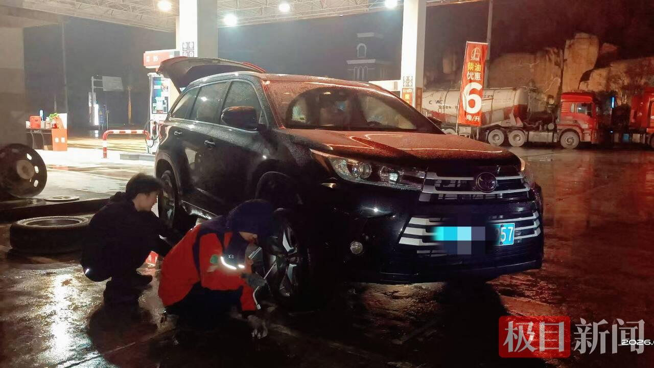 据了解,这位车主此前从未经历过爆胎,毫无更换经验,面对工具和备胎显得有些手足无措。员工陈昌华一边安抚车主情绪,一边掏出手机查找教学视频。两人在视频指导下,支起千斤顶、拆卸螺栓、更换备胎,整个过程配合默契,最终成功完成换胎。