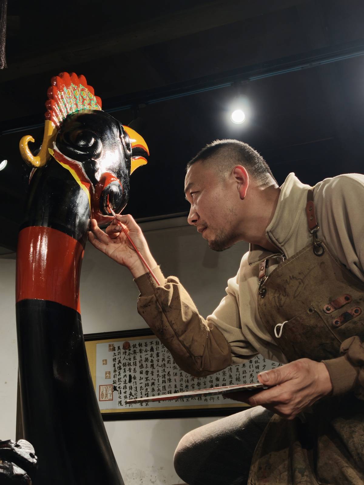 襄阳市传统漆器博物馆馆长隗鹏为雕塑上漆。(采访对象供图。)